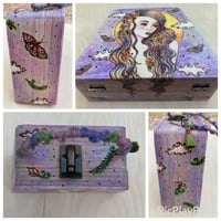Enjoy this decorative, tiny wooden purse box! Note that there are two images for this purse, a female figure for the front and a purple butterfly on the back. Butterflies, clouds, and leaves wrap around the top, bottom, and sides as well. I hand-wrapped this beautiful matching strap and added a matching green tassel.